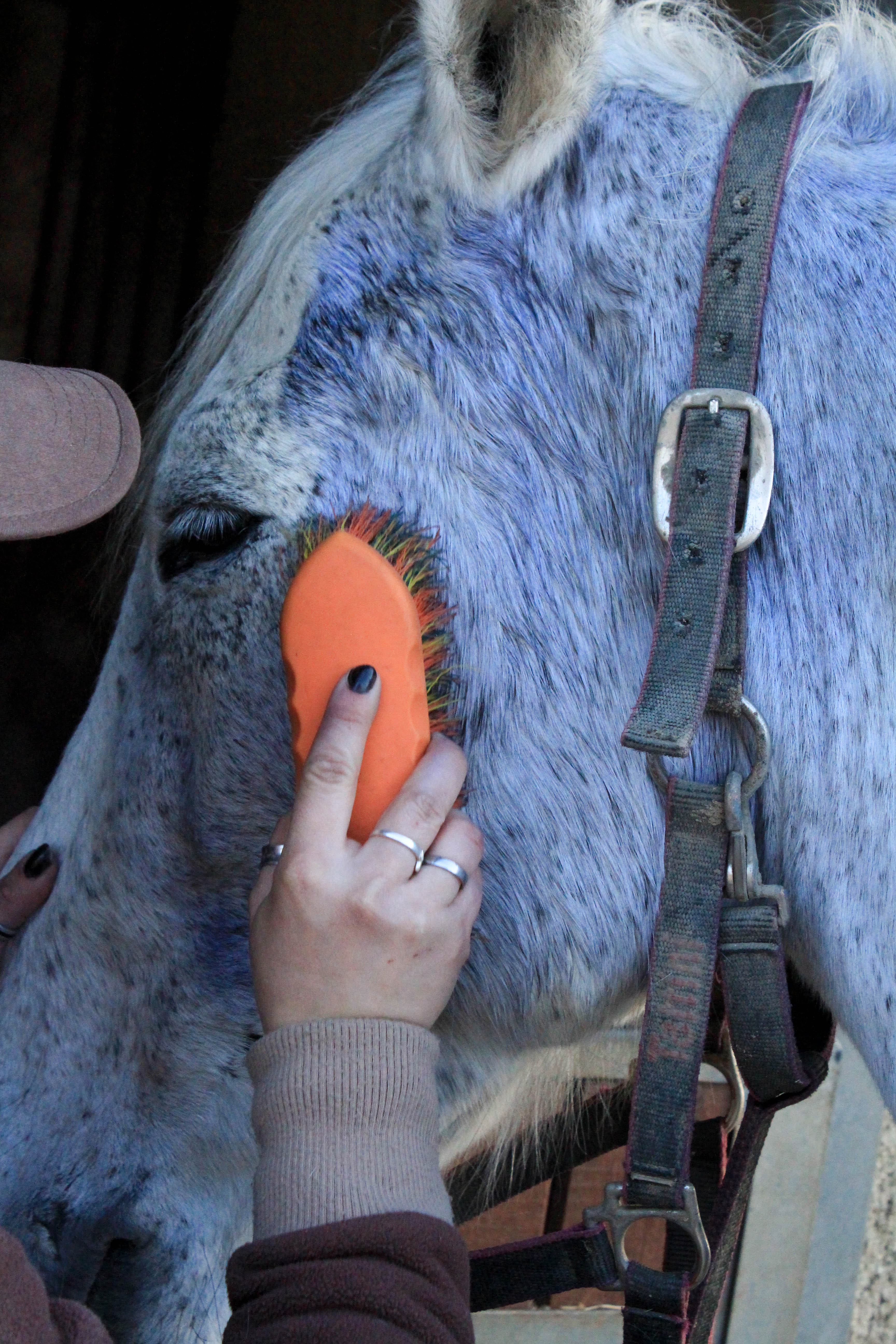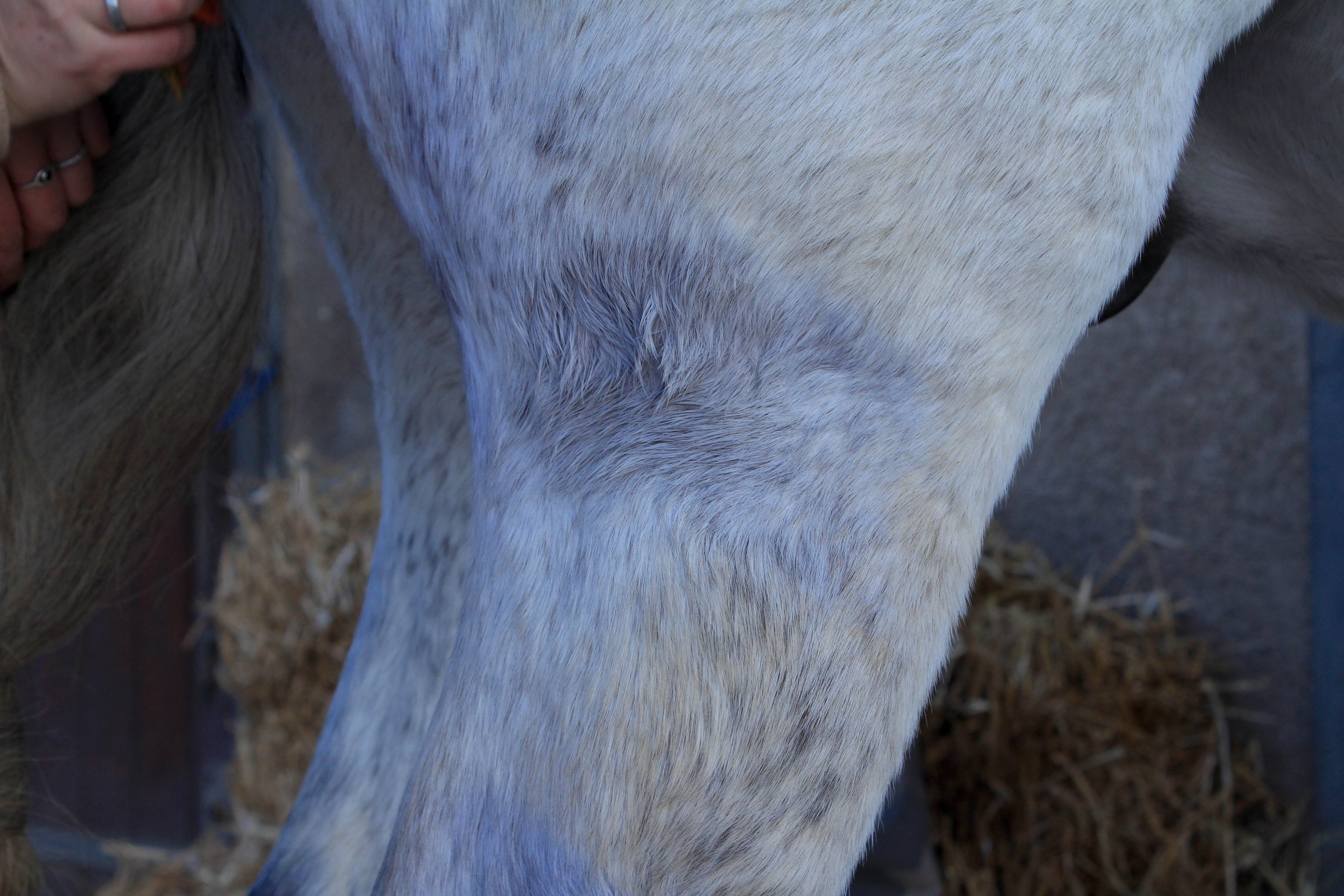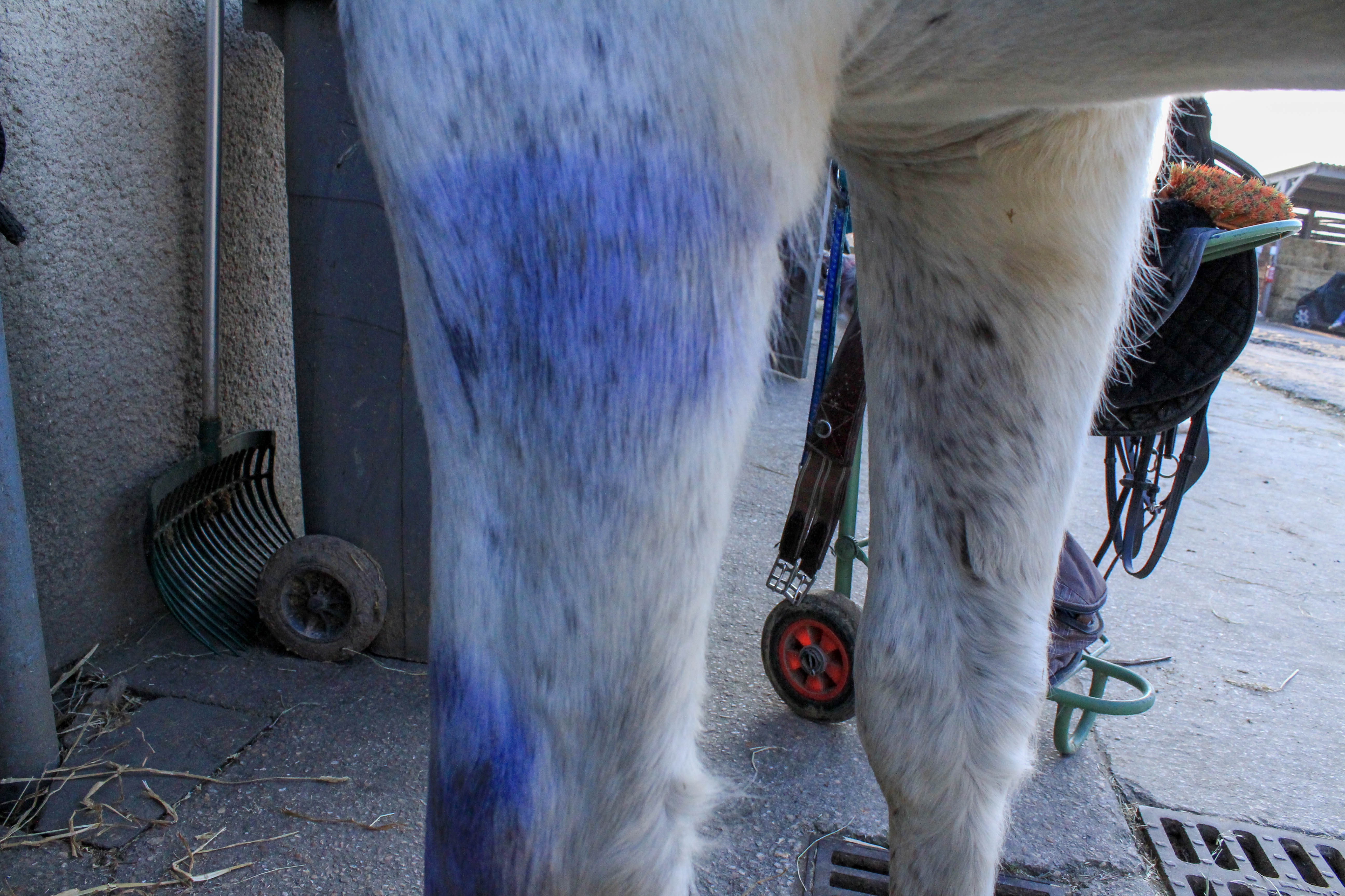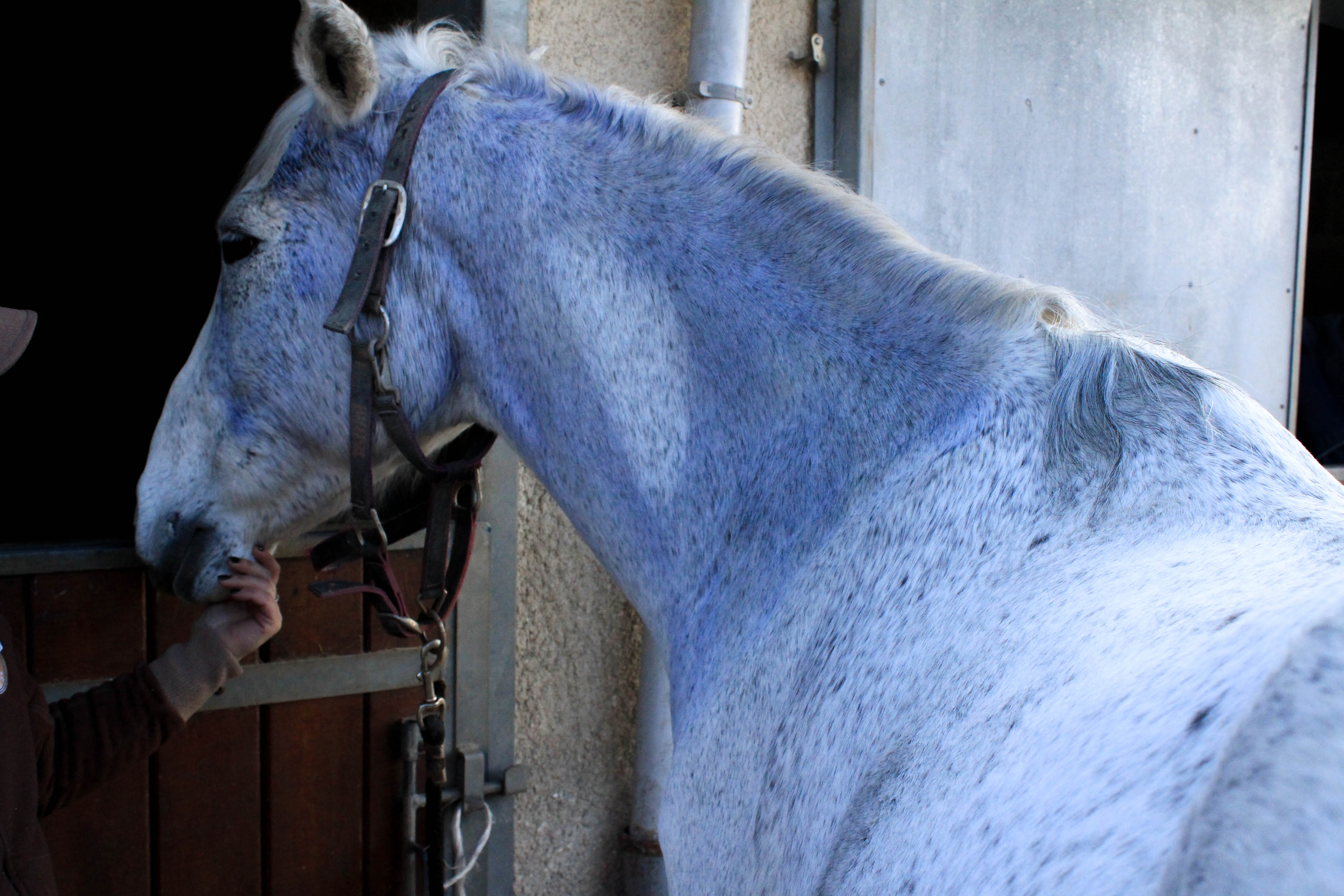 Il fonctionne tellement bien qu’on retrouve même une robe « plus blanc que blanc » car les autres parties que l’on ne soupçonnait pas sales paraissaient encore plus sales !!! Au final pour être sûr : peins ton cheval avec le produit magic purple ton cheval finit violet comme ceci :